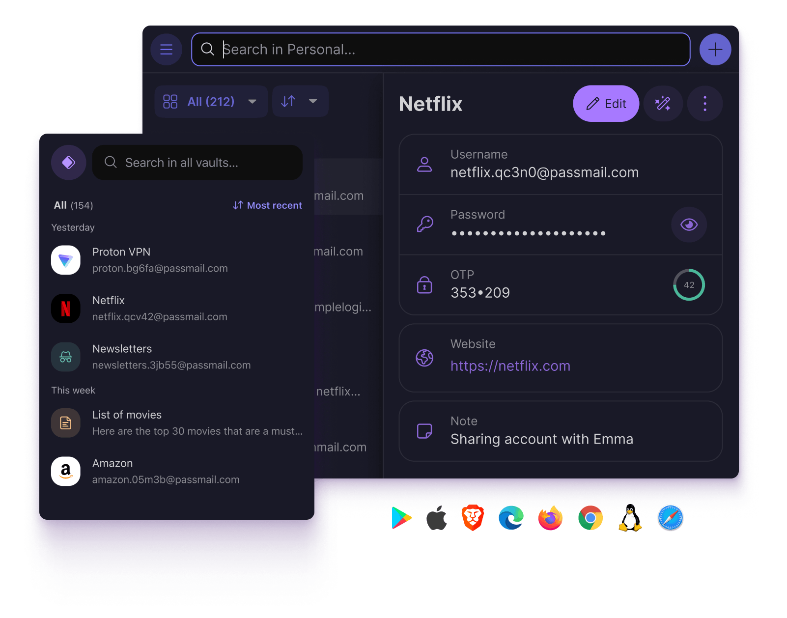Proton Pass is a password manager developed by the Swiss software company Proton AG. It stores login credentials, email aliases, credit card data, passkeys, 2FA secret keys, and notes in virtual vaults.